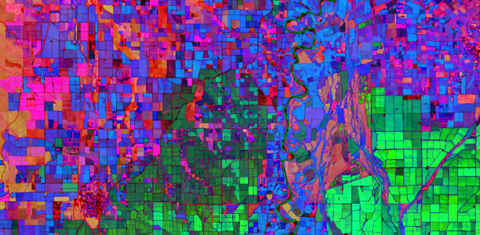 These were combined into a phenological RGB composite, offering a vivid depiction of how crops differ not just by color, but by how their NDVI changes over time.